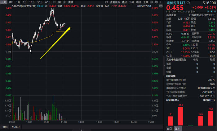 今日A股继续大涨,大盘指数继续涨超3500点,光伏板块继续大涨,截至2025年7月10日11:20,费率最低档的光伏龙头ETF(516290)强势反攻,放量大涨,一度涨超3%,现涨2.02%! 资金跑步进场,光伏龙头ETF(516290)近10个交易日内有6日资金净流入,合计“吸金”1217万元。