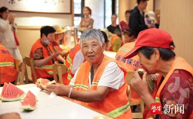 新海街道的公益伙伴状元面馆也参加了此次送清凉活动,店里摆放着熬煮好的绿豆汤、切好的西瓜,辖区50余名环卫工人围坐在店内乘凉、喝汤消暑,志愿者们还为他们贴心的送上清凉物资,嘱咐他们注意身体。前来取餐的外卖骑手都可以免费享用绿豆汤。