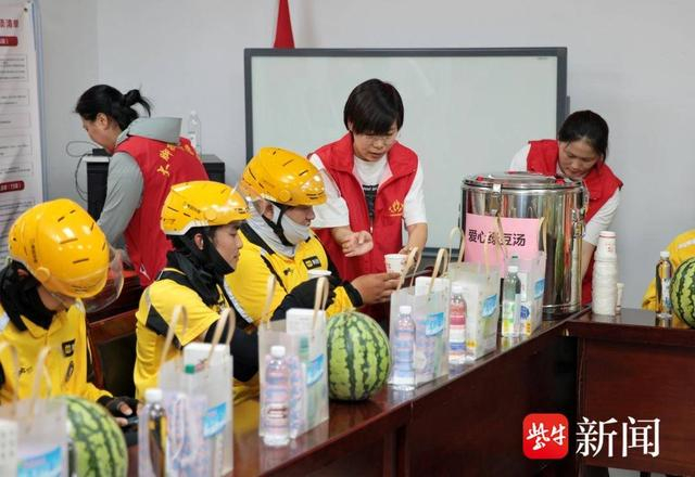 新海街道的公益伙伴状元面馆也参加了此次送清凉活动,店里摆放着熬煮好的绿豆汤、切好的西瓜,辖区50余名环卫工人围坐在店内乘凉、喝汤消暑,志愿者们还为他们贴心的送上清凉物资,嘱咐他们注意身体。前来取餐的外卖骑手都可以免费享用绿豆汤。
