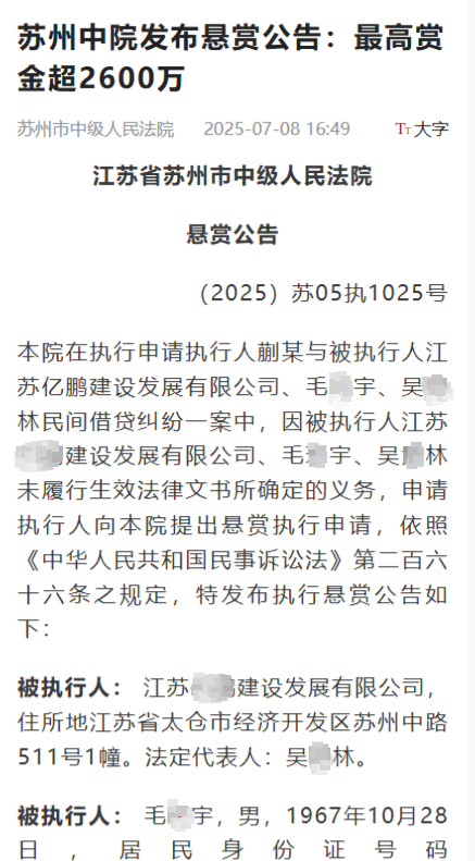 7月8日,江苏省苏州市中级人民法院发布一则悬赏公告称,法院在执行申请执行人蒯某与被执行人江苏亿鹏建设发展有限公司、毛某宇、吴某林民间借贷纠纷一案中,因被执行人江苏亿鹏建设发展有限公司、毛某宇、吴某林未履行生效法律文书所确定的义务,申请执行人向法院提出悬赏执行申请,涉案标的为132499962元,对举报人给予实际执行到位金额20%的比例作为赏金。根据比例计算,该悬赏的最高赏金超2600万元。这背后涉及怎样的纠纷?7月10日,记者分别联系到该案申请执行人和被执行人进行了了解。