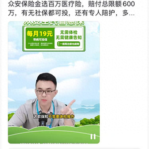 在抖音平台,澎湃新闻留意到众安保险的两款保险:“众安全民普惠保”和“众安百万医疗险”,前者宣传“每月19元,无需体检、无需健康告知,责任内一般既往症也能赔”。