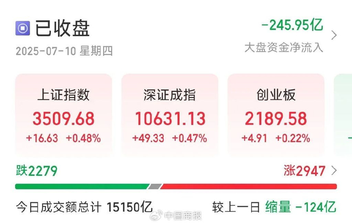中国商报(记者 马文博)7月10日,经过昨天的冲高回落,沪指今天终于在收盘时站上3500点!截至收盘,A股三大指数集体上涨,沪指涨0.48%,深成指涨0.47%,创业板指涨0.22%,北证50指数跌0.16%。全市场成交额为15150亿元,较上一日缩量124亿元。全市场超2900只个股上涨。