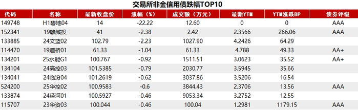 据Choice 数据统计显示,今日交易所市场非金信用债跌幅排行前五的分别是:H1碧地04、19赣城投、24文蓝02、19道桥01、25水能G1。具体如下: