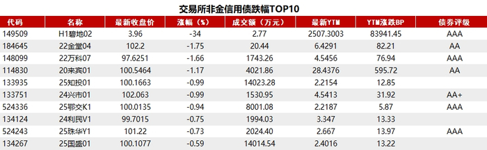 据Choice 数据统计显示,今日交易所市场非金信用债跌幅排行前五的分别是:H1碧地02、22金堂04、22万科07、20来宾01、25知投01。具体如下: