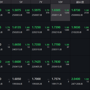 银行间主要利率债收益率全线上行,截至下午16:30,10年期国债活跃券250011收益率上行1.35bp报1.6585%,30年期国债活跃券2500002收益率上行1.3bp报1.873%,10年期国开活跃券250210收益率上行1.5bp报1.739%。