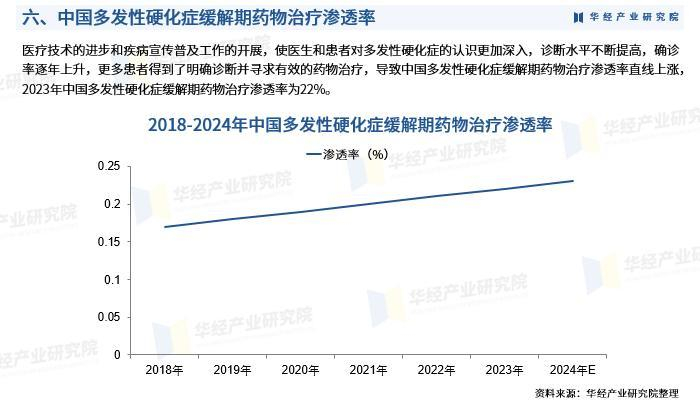 医疗技术的进步和疾病宣传普及工作的开展,使医生和患者对多发性硬化症的认识更加深入,诊断水平不断提高,确诊率逐年上升,更多患者得到了明确诊断并寻求有效的药物治疗,导致中国多发性硬化症缓解期药物治疗渗透率直线上涨,2023年中国多发性硬化症缓解期药物治疗渗透率为22%。