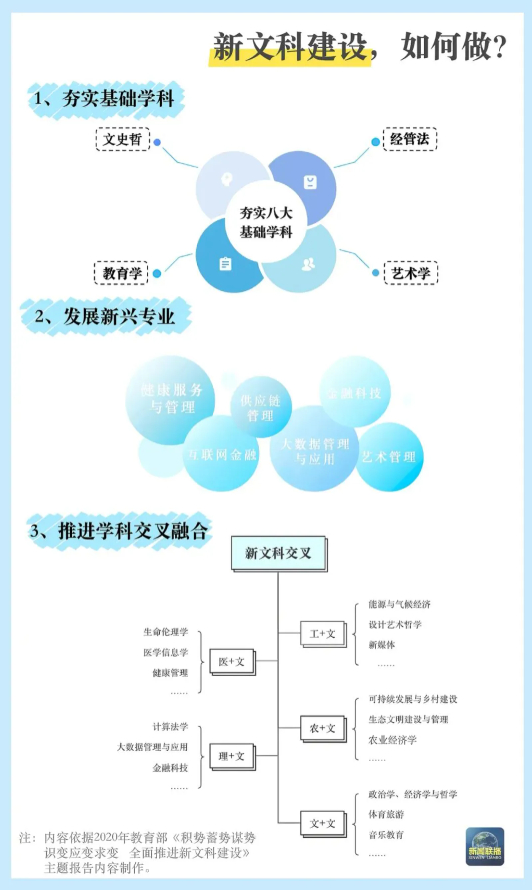 2023年3月,教育部等五部门印发《普通高等教育学科专业设置调整优化改革方案》,再次为文科发展指出方向:推动文科间、文科与理工农医学科交叉融合,积极发展文科类新兴专业,推动原有文科专业改造升级;推进文科专业数字化改造,深化文科专业课程体系和教学内容改革等。根据教育部发布的2025年普通高校本科专业目录,以及最新本科专业备案和审批结果,增设29种本科新专业,纳入今年高考招生,这29种本科新专业中也包含很多“新文科”专业。涉及到文学、教育学、管理学、艺术学等学科门类。