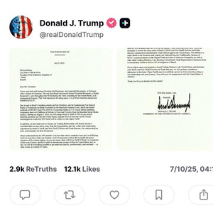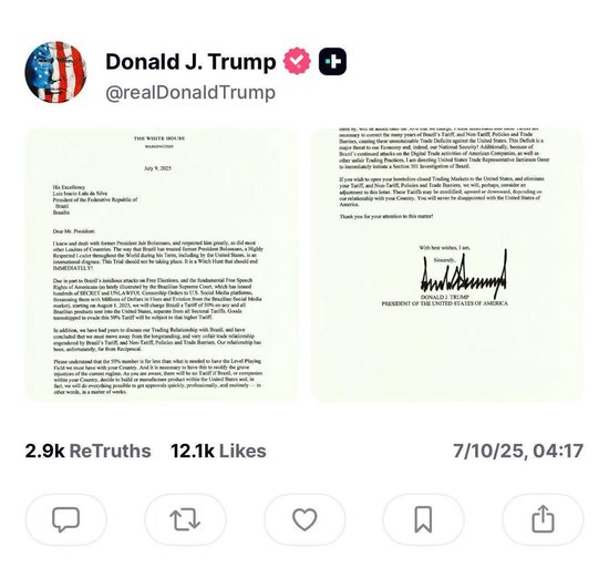 这是特朗普在社交媒体上发布致卢拉信函的截图特朗普在信中声称,巴西的“关税、非关税政策以及贸易壁垒”造成该国与美国的贸易关系“长期以来(对美国)非常不公平……导致不可持续的美国(对巴西)贸易逆差”。