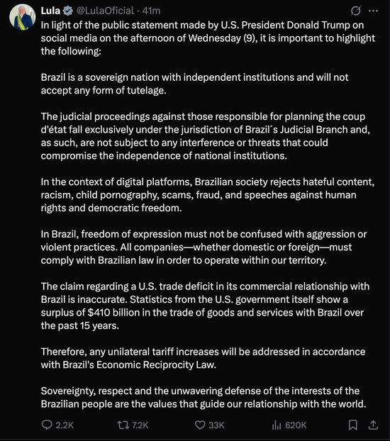 针对特朗普的说法,卢拉在社交媒体上反驳说,美国政府的统计数据显示,过去15年,美国对巴西的商品和服务贸易顺差约为4100亿美元。他强调,巴西是一个主权国家,不受任何外来干涉。