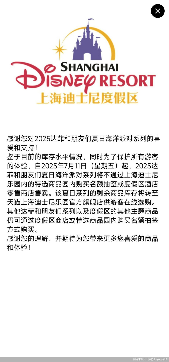 北京商报讯(记者 吴其芸)7月10日,上海迪士尼度假区发布公告称,鉴于目前的库存水平情况,同时为了保护所有游客的体验,自2025年7月11日(星期五)起,“2025达菲和朋友们夏日海洋派对系列”将不通过上海迪士尼乐园内的特选商品园内购买名额抽签或度假区酒店零售商店售卖。该夏日系列的剩余商品库存将转至天猫上海迪士尼乐园官方旗舰店供游客在线选购。其他达菲和朋友们系列以及度假区的其他主题商品仍可通过度假区商店或特选商品园内购买名额抽签方式购买。