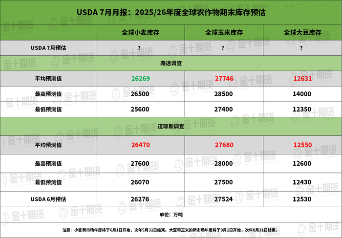 路透和道琼斯均预计USDA将下调美国小麦期末库存预估,分别为8.95亿蒲和8.93亿蒲,USDA 6月月报预估为8.98亿蒲。