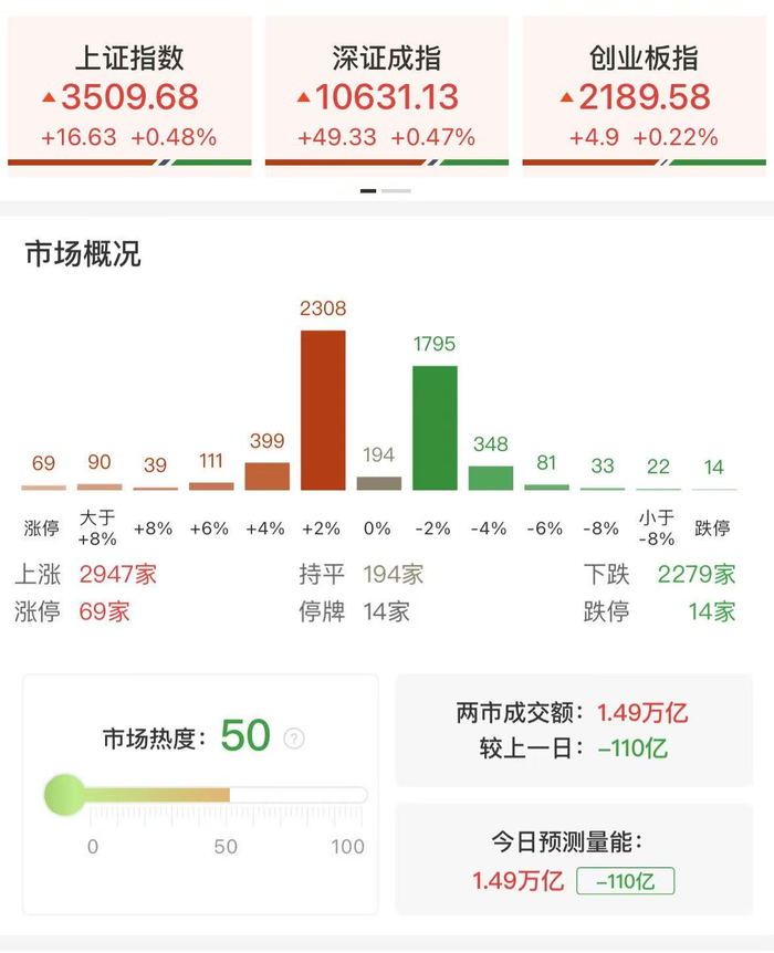 财联社7月10日讯,市场午后冲高回落,三大指数小幅上涨,沪指重回3500点上方。沪深两市全天成交额1.49万亿,较上个交易日缩量110亿。盘面上,市场热点较为杂乱,个股涨多跌少,全市场超2900只个股上涨。从板块来看,地产、城镇化概念股集体爆发,渝开发等多股涨停。银行等大金融股一度冲高,工、农、中、建四大行续创历史新高。硅能源、光伏概念股持续活跃,京运通等涨停。下跌方面,PCB概念股展开调整,宏和科技跌停。截至收盘,沪指涨0.48%,深成指涨0.47%,创业板指涨0.22%。