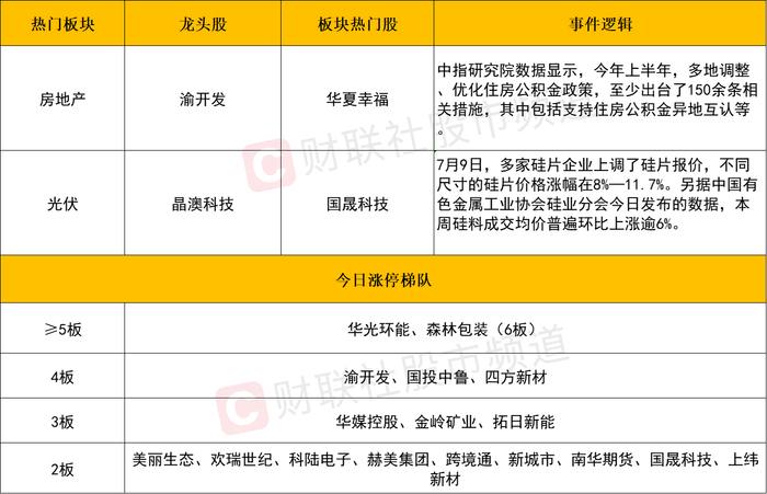 硅能源、光伏概念股持续活跃,京运通、弘元绿能、协鑫集成、晶澳科技、国晟科技等涨停。消息面上,7月9日,多家硅片企业上调了硅片报价,不同尺寸的硅片价格涨幅在8%—11.7%。另据中国有色金属工业协会硅业分会今日发布的数据,本周硅料成交均价普遍环比上涨逾6%。