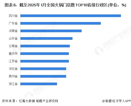 火锅门店数TOP10的省级行政区中,四川省以11%数量占比位居全国第一。值得关注的是,云南和贵州的占比相比2024年有所提升,这或主要是由于酸汤火锅和山野火锅等热门细分赛道的崛起,推动云南和贵州火锅门店数增长。