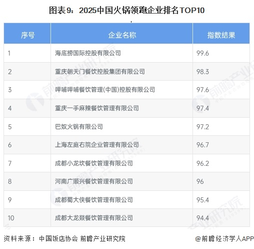 2025年5月,中国饭店协会在第十五届中国火锅产业大会上发布《2025火锅领跑企业TOP100名单》,领跑指数包含经营指标和评价指标两大维度,其中经营指标包含2024年度营业额、直营门店数、加盟合作门店数、翻台率;评价指数包含消费者口碑评分以及业内专家团评分。从地区上看,川渝两地展现出强劲发展动力,来自两地的企业占据名单半壁江山,TOP10企业中占7名。同时,来自北方及长三角地区部分品牌凭借特色单品或创新产品在榜单内占据一席之地。从品类上看,川渝式火锅在TOP100上榜品牌中仍占据主导地位,占比达到60%。