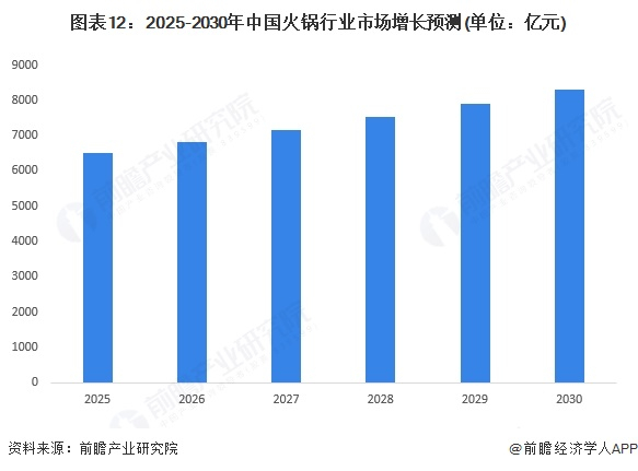 未来,消费需求推动品牌化与连锁化,头部企业凭借规模优势巩固市场地位,小火锅、自助火锅等高性价比细分赛道有望崛起;另一方面,产品创新成为竞争关键,企业需在口味、食材、服务上持续创新。同时跨界合作将带来更多特色体验,通过“火锅+”的形式通过扩大品类来满足消费者多样性的需求,其中饮品、甜品、小吃是火锅品牌最常增加的品类,这些品类与火锅具有互补性,能有效提升人均消费金额。此外,数字化转型加速,智能点餐系统、无人配送等技术提升服务效率与顾客体验,健康化趋势愈发明显,低脂、低盐、高纤维食材受青睐,营养搭配与养生元素成卖点。 前瞻初步测算,到2030年我国火锅市场规模有望达到8296亿元。