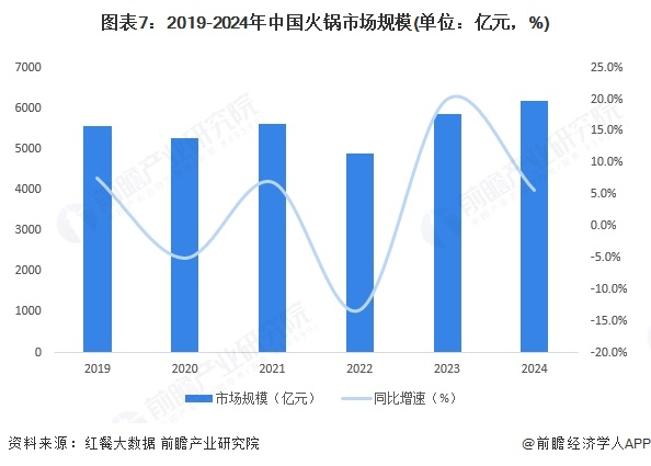 火锅品类近几年受市场需求增长及可扩张性,高标准化的独特业务模式,成为餐饮细分中一大品类。根据红餐大数据,2019年我国火锅市场规模为5554亿元,2020年至2022年,行业受新冠疫情冲击,市场规模波动变化,2023年火锅行业市场规模有所回温,2024年市场规模达到6175亿元,同比增长5.6%。