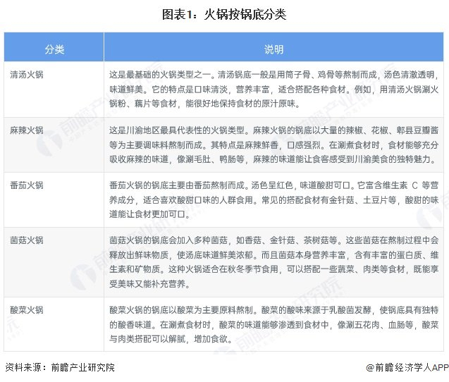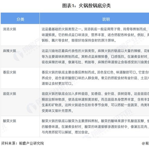 按锅底类型分类,火锅可分为清汤火锅、麻辣火锅、番茄火锅、菌菇火锅和酸菜火锅。