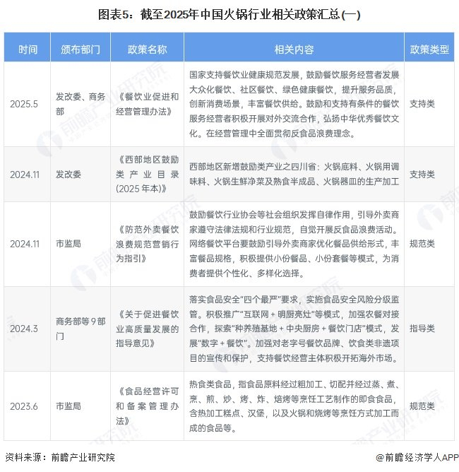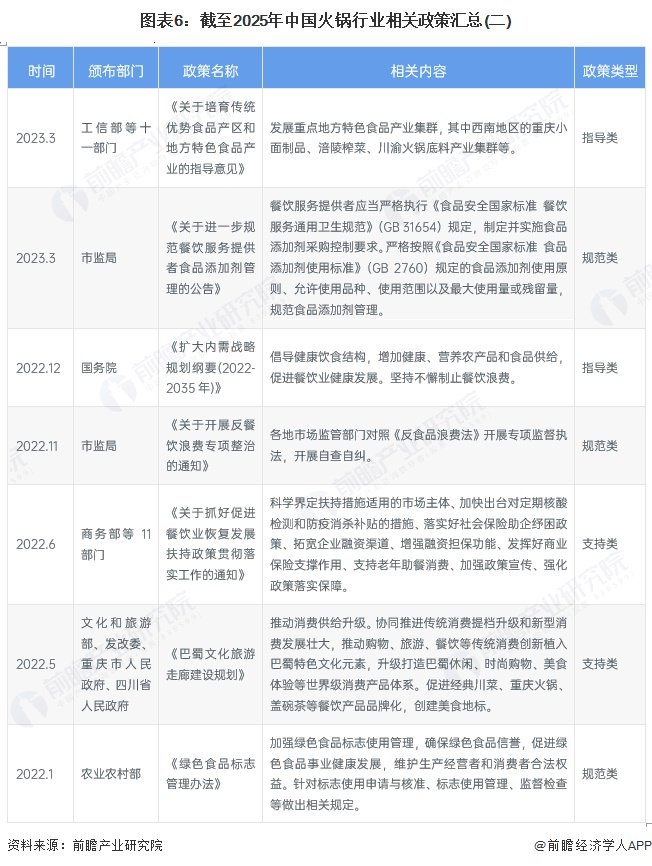 近年来,国家出台《餐饮业促进和经营管理办法》、《关于促进餐饮业高质量发展的指导意见》等政策,为餐饮行业的发展提供了良好的宏观环境和政策支持。政策鼓励餐饮企业加大创新投入,推动菜品创新、服务创新和经营模式创新,为火锅企业提供了更多的发展空间和机遇。在产业融合创新方面,政策鼓励餐饮业与其他产业的融合发展,为火锅行业带来了新的发展机遇。例如,“火锅+文旅”模式得到了政策的大力扶持,推动了火锅消费场景的提升,促进了餐饮业与文化旅游等产业的相互促进、协同发展。具体相关政策如下: