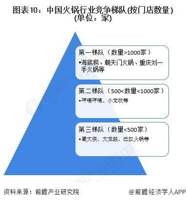 按火锅企业门店数量来看,门店数量在1000家以上的企业有海底捞、朝天门火锅、重庆刘一手火锅等,处于第一梯队;门店数量在500-1000家之间的企业有呷哺呷哺、小龙坎等,在第二梯队;门店数量少于500家的火锅品牌有蜀大侠、大龙燚、巴奴火锅等。