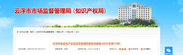 广东省云浮市食品生产企业日常监督检查情况通报(2025年第12号)