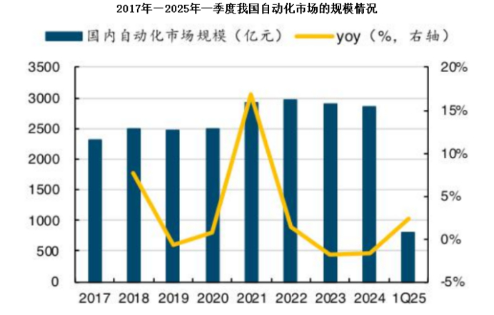 数据显示,2022年以来我国通用自动化市场增速持续放缓,2024年的规模约3000亿元,同比增幅仅0.1%,2025年一季度的同比增速虽说回升至2.35%,但整体仍处于低速增长阶段。