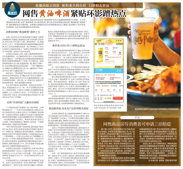 北京青年报记者注意到,最近有多款无醇“黄油啤酒”在各大直播间和网络平台热销。不少消费者购买后发现,这些“黄油啤酒”从名称到宣传,都与北京环球影城内售卖的“黄油啤酒”高度相似,疑似紧靠知名IP蹭热度。
