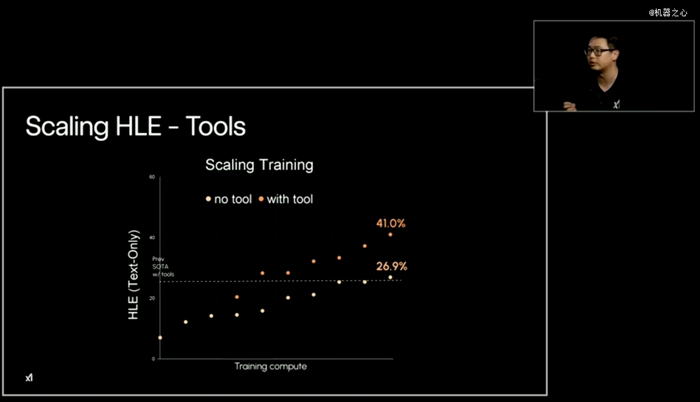在今天的直播中,xAI 研究人员表示,以往的 SOTA 模型在使用工具(with tool)的情况下,成绩最高可以达到 41.0%。