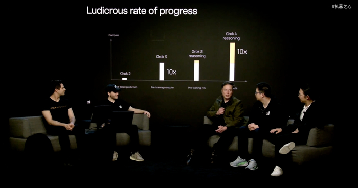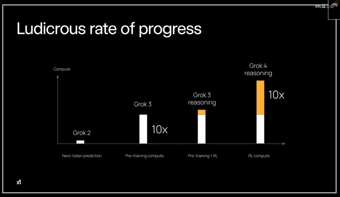 其中,Grok 2 到 Grok 3 预训练阶段的计算量提升了 10 倍,Grok 3 reasoning 首次引入了 RL 微调,带来了深度推理能力。Grok 4 reasoning 的强化学习再度提升了 10 倍的计算量,这意味着显著的推理能力提升。
