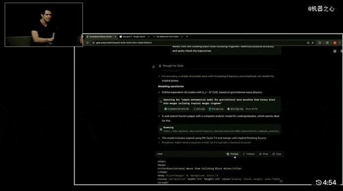 Grok 4 几乎完整地呈现了从两个黑洞接近到最后合并结束的引力波模拟效果。动图的一边是推理过程和计算的步骤和代码,查阅的论文每一篇都有链接。