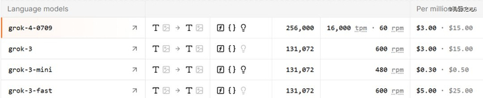 Grok 4 可通过 API 调用,提供 256K tokens 的上下文窗口。目前已经开放使用,版本号为 grok-4-0709,价格与 Grok 3 相同。