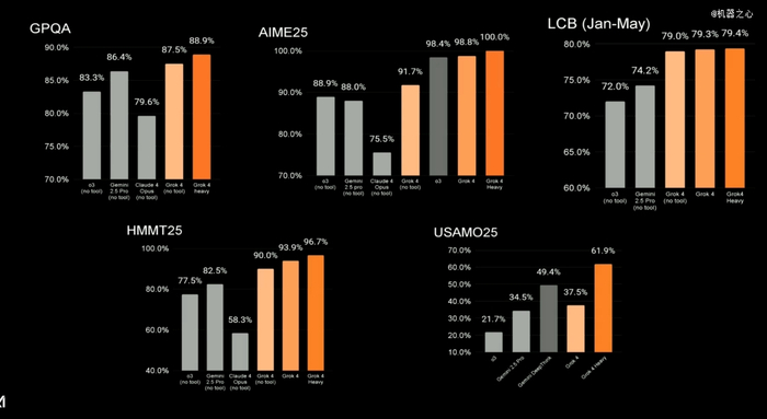 关于其他更多基准测试结果,包括 GPQA(研究生级别的 Google 验证问答基准测试)、AIME25(美国数学竞赛邀请赛)、LCB(Jan-May)(编程竞赛 / 在线算法竞赛)、HMMT25(高中生团队数学竞赛)和 USAMO25(美国*高中生数学竞赛)。从下图可以看到,Grok 4 Heavy 均取得了最新 SOTA。