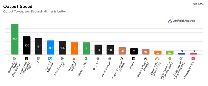 根据 Artificial Analysis 的测试,xAI 的 API 当前以每秒 75 个 token 的速度提供 Grok 4 服务,速度虽不及 o3(每秒 188 个 token),但优于 Claude 4 Opus Thinking(每秒 66 个 token)。