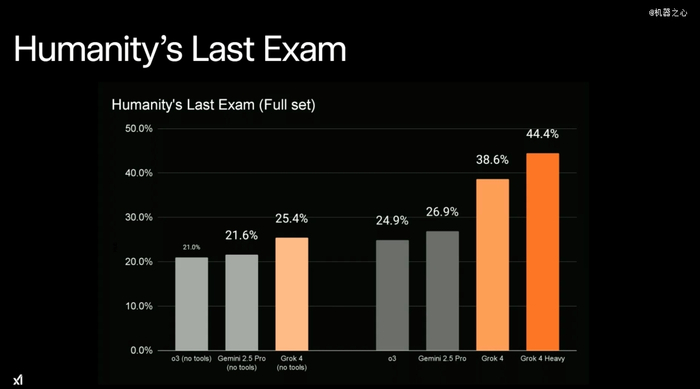首先是 HLE(Humanities Last Exam,人类最后的考试),包括数学、化学和逻辑学。在上周六泄露的基准测试结果中,Grok 4 在 HLE(Humanities Last Exam,人类最后考试)上的标准得分是 35%,使用推理技术后提高到 45%,但多数网友持质疑态度。