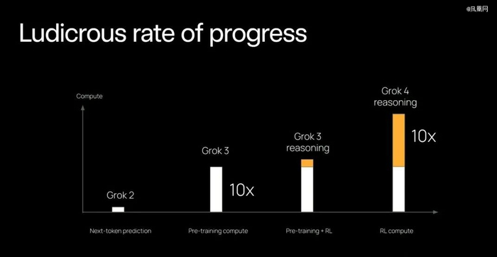 与Grok 2相比,Grok 4训练量增加了100倍,并且还在持续扩张。特别是在推理和强化学习(RL)方面,Grok 4投入了大量计算资源,其RL计算量是其他任何模型的10倍以上。