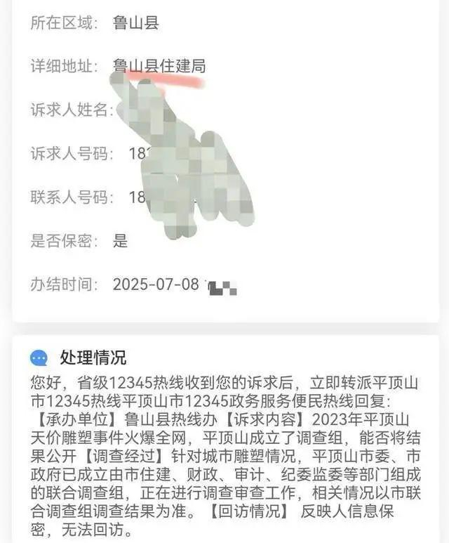 其提供的投诉回复截图显示,办结时间为2025年7月8日上午,处理情况为,鲁山县热线办承办,针对城市雕塑情况,平顶山市委、市政府已成立由住建、财政、审计、纪委监委等部门组成的联合调查组,正在进行调查审查工作,相关情况以市联合调查组调查结果为准。