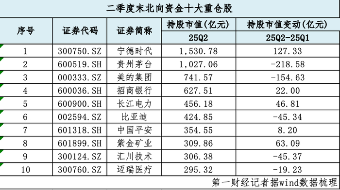 Wind数据显示,以6月30日收盘价×持股变动量计算,二季度末,北向资金的第一大重仓股为宁德时代,持股市值约为1530.78亿元,较一季度末增加127.33亿元;作为第二大重仓股的贵州茅台(600519.SH),北向资金持股市值虽超过1000亿元,但二季度出现明显缩水,减少218.58亿元。此外,招商银行(60036.SH)、长江电力(600900.SH)、中国平安、紫金矿业(601899.SH)等个股被加仓,跻身北向资金前十大重仓股名单。