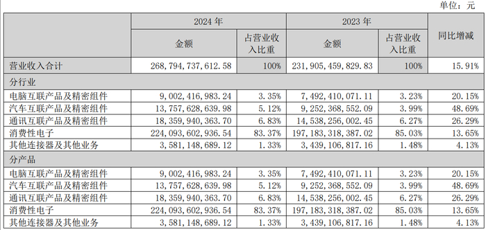 2024年,立讯精密的汽车业务实现销售额137.6亿元,同比增长48.7%,营收首次迈过百亿门槛。但其仅在整体营收中占比5%左右。