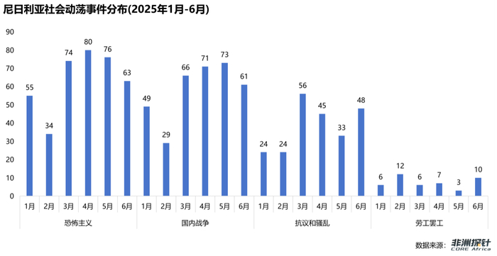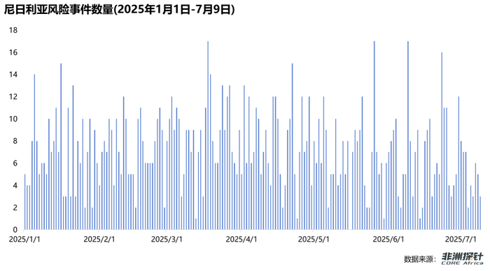 “非洲探针”数据显示,2025年以来,尼日利亚累计监测到的各类风险事件共计1383起,1月至6月平均每月监测到的风险事件为223起。分析发现,尼日利亚风险事件总量和月均量均居非洲之首,整体安全形势复杂严峻。