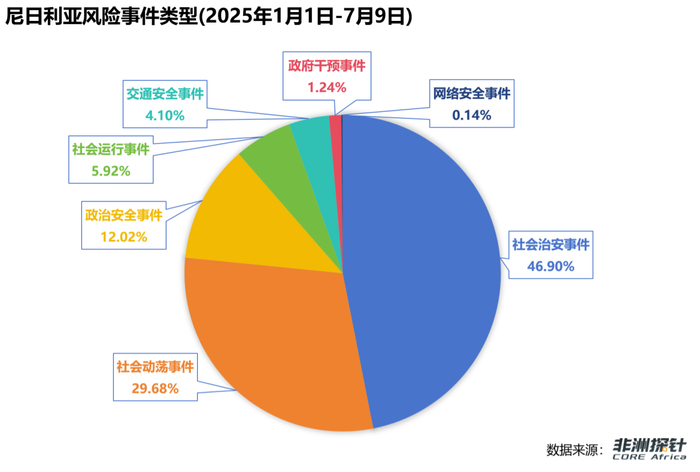 从事件类型看,尼日利亚风险事件涉及社会治安、政治安全、社会动荡、交通安全、社会治理、政府干预、网络安全等多个类别。其中,社会治安事件、社会动荡事件、政治安全事件数量位居前三,占比分别为46.90%、29.68%和12.02%。