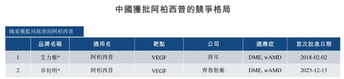 目前中国市场已获批两款阿柏西普类药物用于治疗眼底新生血管性疾病:拜耳原研药艾力雅自2018年获批以来,已覆盖湿性黄斑变性、糖尿病性黄斑水肿等适应症;齐鲁制药的生物类似药卓初明于2023年获批上市,成为国内首个该类生物类似药。