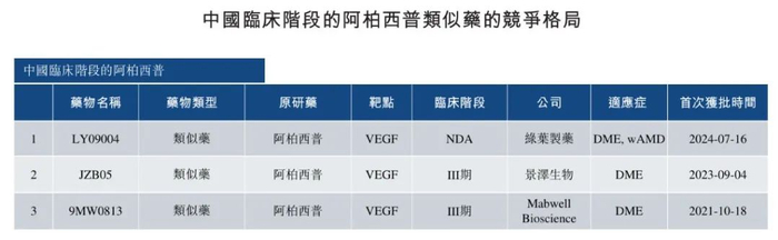 值得关注的是,除景泽生物的JZB05外,国内另有两家企业的阿柏西普生物类似药正处于糖尿病性黄斑水肿(DME)的临床研究阶段,其中绿叶制药处于NDA(新药上市申请)阶段,另一家同样处于III期临床阶段。