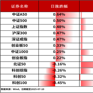 7月10日,A股三大股指全线上涨,上证指数收涨0.48%,深证成指收涨0.47%,创业板指收涨0.22%,延续回暖态势。主流宽基指数中,中证A50上涨0.64%,涨幅相对居前。全市场共有超2,900只股票上涨。