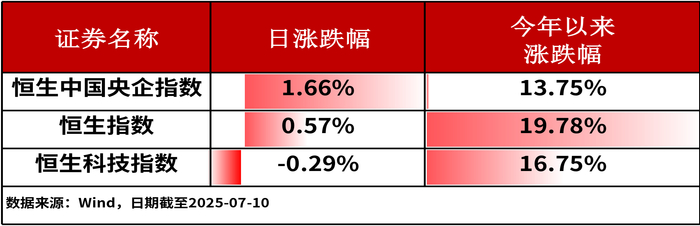 7月10日,港股三大股指涨跌互现,其中恒生中国央企指数上涨1.66%,涨幅相对居前。