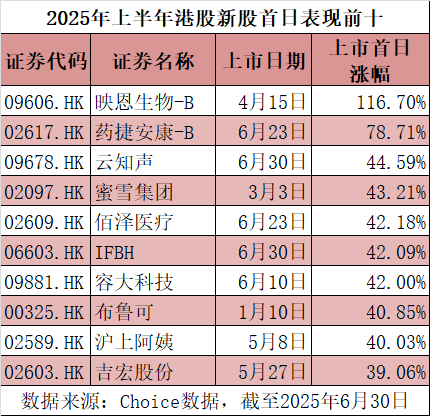 具体到个股表现,上半年在港股上市的新股首日表现最好的是映恩生物-B,首日涨幅达到116.7%;然后是药捷安康-B,首日上涨78.71%;此外,云知声、蜜雪集团、佰泽医疗、布鲁可、沪上阿姨等7只个股上市首日的涨幅超过40%。记者注意到,首日涨幅排名靠前的个股多数来自生物医药、新消费等近期港股大热赛道,蜜雪集团上市以来涨幅超过160%,同为新茶饮品牌的古茗上市以来涨幅超过180%。