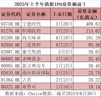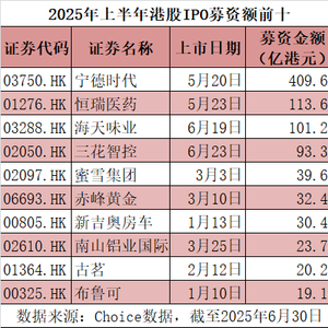 金融投资报记者注意到,港股IPO募资额在5月达到单月峰值,上市公司数量则是6月最多。具体来看,5月共有10家公司上市,募资金额超过570亿港元,这主要归功于宁德时代和恒瑞医药两个大项目的落地。Choice数据统计,宁德时代港股IPO募资409.63亿港元,恒瑞医药港股IPO募资113.62亿港元,截至目前排名2025年港股IPO募资规模前二。6月共有15家公司上市,募资金额接近280亿港元,当月上市的海天味业募资规模超过100亿港元,三花智控募资规模也超过90亿港元。