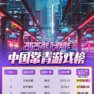 2025年上半年,中国常青游戏市场延续了以老牌游戏为核心的格局。前10中,腾讯霸榜前四,并占据六席;网易2席,米哈游和途游游戏各一。