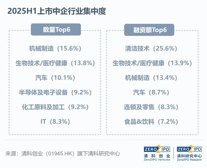 2025年上半年,超七成IPO企业集中在机械制造、生物技术/医疗健康、汽车、半导体及电子设备、化工原料及加工、IT六大行业。在融资额方面,清洁技术行业因收获宁德时代双重上市(首发融资额约为285.23亿元人民币),位列行业融资额首位;生物技术/医疗健康行业因收获恒瑞医药(约合90.85亿元人民币)等较大额融资案例位列行业融资额第二位。连锁及零售行业收获了蜜雪冰城(约合31.45亿元)、霸王茶姬(29.64亿元)等较大融资案例,位列行业融资额第五位。食品&饮料行业因收获了海天味业(约合87.36亿元)港股上市,位列行业融资额第六位。