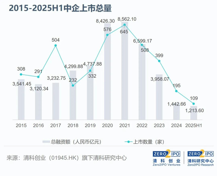 2025年上半年,中企IPO数量同比回升。根据清科创业(01945.HK)旗下清科研究中心统计,2025年上半年中企境内外上市109家【1】,同比上升32.9%、环比下降3.5%;首发融资额约合人民币1213.60亿元【2】,同比上升158.7%、环比上升24.7%。分市场来看,2025年上半年A股共有51家企业上市,同比上升15.9%、环比下降8.9%;境外市场共58家中企上市,同比上升52.6%、环比上升1.8%。地域方面,浙江上市企业数量居首位,福建融资规模第一。行业方面,机械制造行业表现相对稳健。
