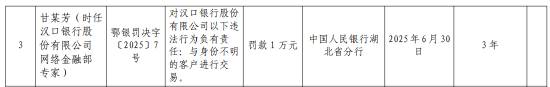 同时,宫某华(时任汉口银行股份有限公司交易银行部总经理)对汉口银行股份有限公司以下违法行为负有责任:未按规定履行客户身份识别义务,被罚款1.4万元;甘某芳(时任汉口银行股份有限公司网络金融部专家)对汉口银行股份有限公司以下违法行为负有责任:与身份不明的客户进行交易,被罚款1万元。